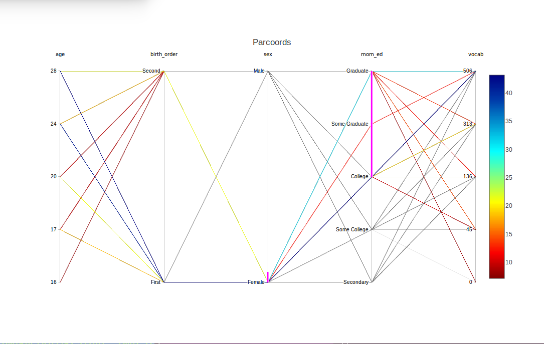 The magenta highlights show that sex and mom_ed were brushed, and in the latter case, specifically the levels ‘College’, ‘Some Graduate’ and ‘Graduate’. Lines with all other combinations now appear in light gray.